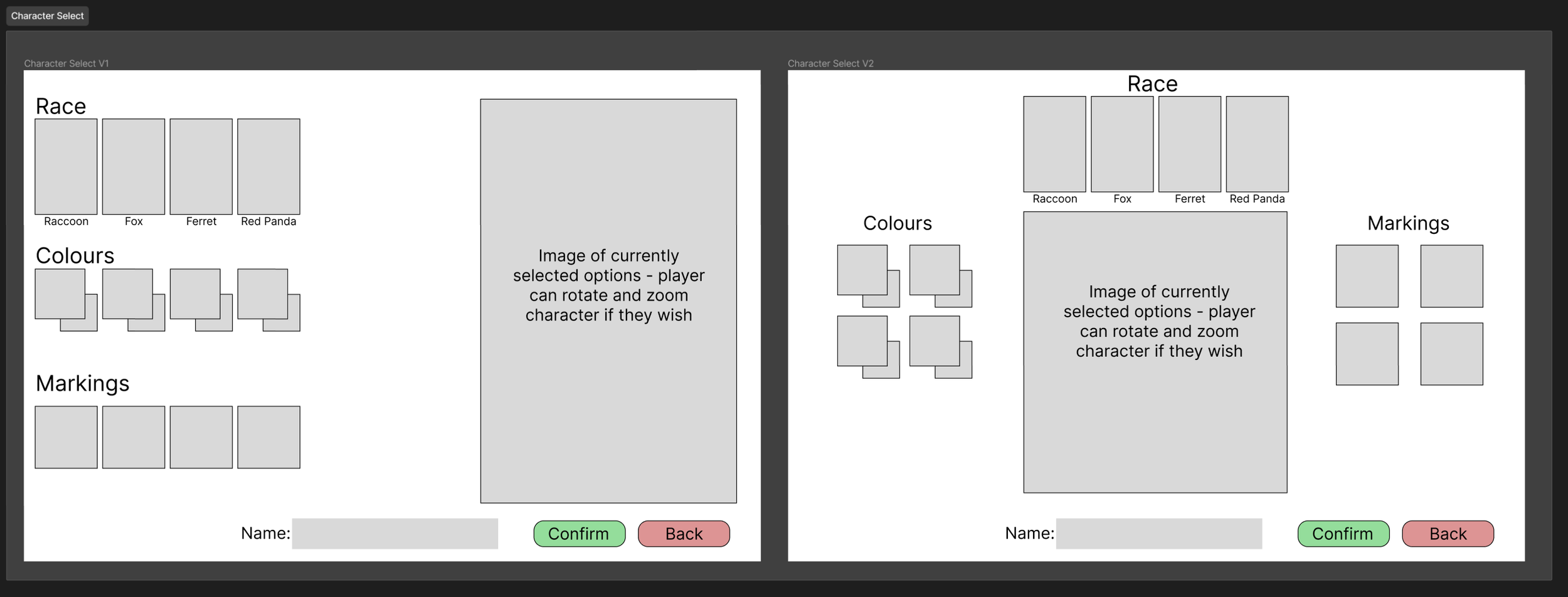 We wanted to allow some customisation, but not have an overwhelming character creator. Three options plus a name field gave a comfortable amount of permitations